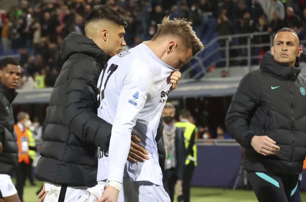 Inter Milan's Ionut Radu, center, after the Serie A soccer match between Bologna and Inter Milan at Renato Dall'Ara stadium in Bologna, Italy, Wednesday April 27, 2022. Bologna won the match 2-1. (Michele Nucci/LaPresse via AP)
