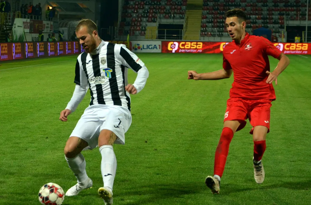 Denis Alibec si Razvan Opurt in meciul de fotbal dintre Astra Giurgiu si AFC Hemannstadt, din cadrul Ligii 1 Casa Pariurilor, desfasurat pe Stadionul Marin Anastasovici din Giurgiu, luni 7 octombrie 2019. © FOTO:SPORT PICTURES