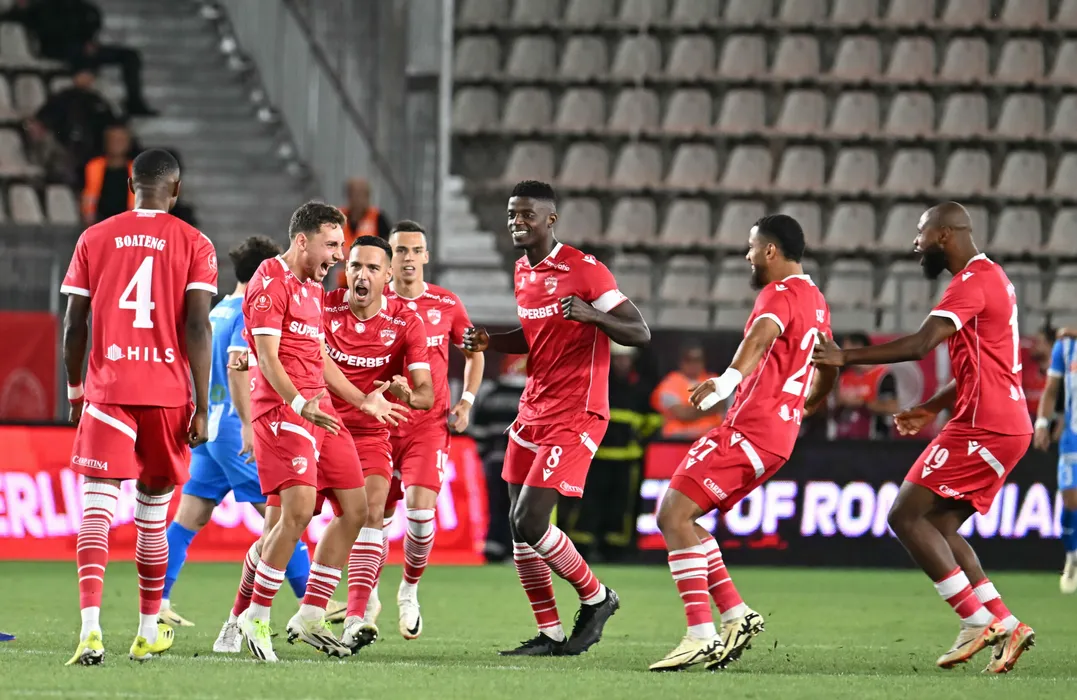 Bucurie a fotbaliștilor dinamoviști Andrei Ahmed Mustafa Bani, Georgi Milanov Ventsislavov, Catalin Ionut Cirjan, Vhakka Eddy Stelh Gnahore, Maxime James Sivis si Hakim Djamel Abdallah după un gol marcat in meciul de fotbal dintre Dinamo Bucuresti si Universitatea Craiova, din cadrul Superligii Superbet, desfasurat pe Stadionul National Arcul de Triumf din Bucuresti, sambata 24 august 2024. © FOTO:Razvan Pasarica/SPORT PICTURES