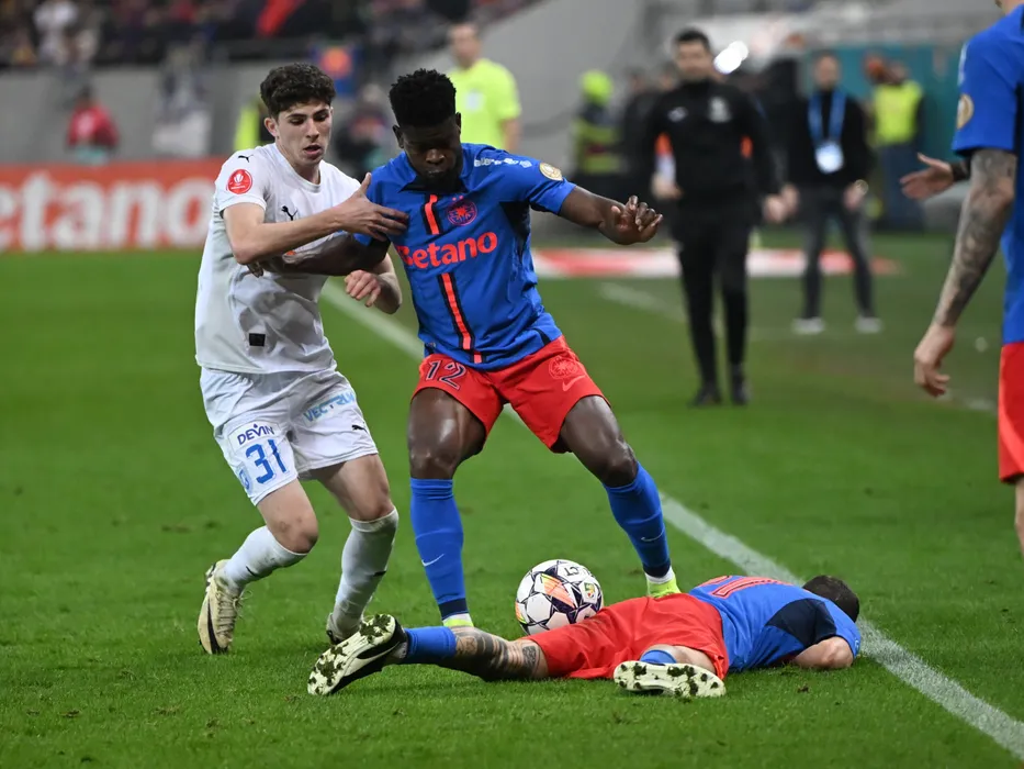 Stefan Daniel Bana si Enagnon David Kiki in meciul de fotbal dintre FCSB si Universitatea Craiova, din cadrul Superligii Superbet, desfasurat pe Arena Nationala din Bucuresti, duminica 9 martie 2025. © FOTO:Razvan Pasarica/SPORT PICTURES