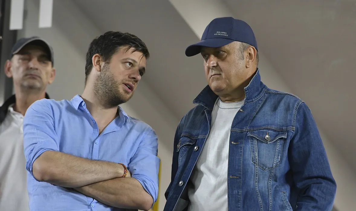 Victor Angelescu si Dan Sucu discuta in tribuna la meciul de fotbal dintre Romania si Muntenegru, contand pentru Liga Natiunilor, desfasurat pe Stadionul Rapid Giulesti din Bucuresti, marti 14 iunie 2022. Bucuresti *** Victor Angelescu and Dan Sucu discuss in the stands at the football match between Romania and Montenegro, counting for the League of Nations, held on Rapid Giulesti Stadium in Bucharest, Tuesday, June 14, 2022 Bucharest Copyright: xRazvanxPasarica/SPORTxPICTURESx