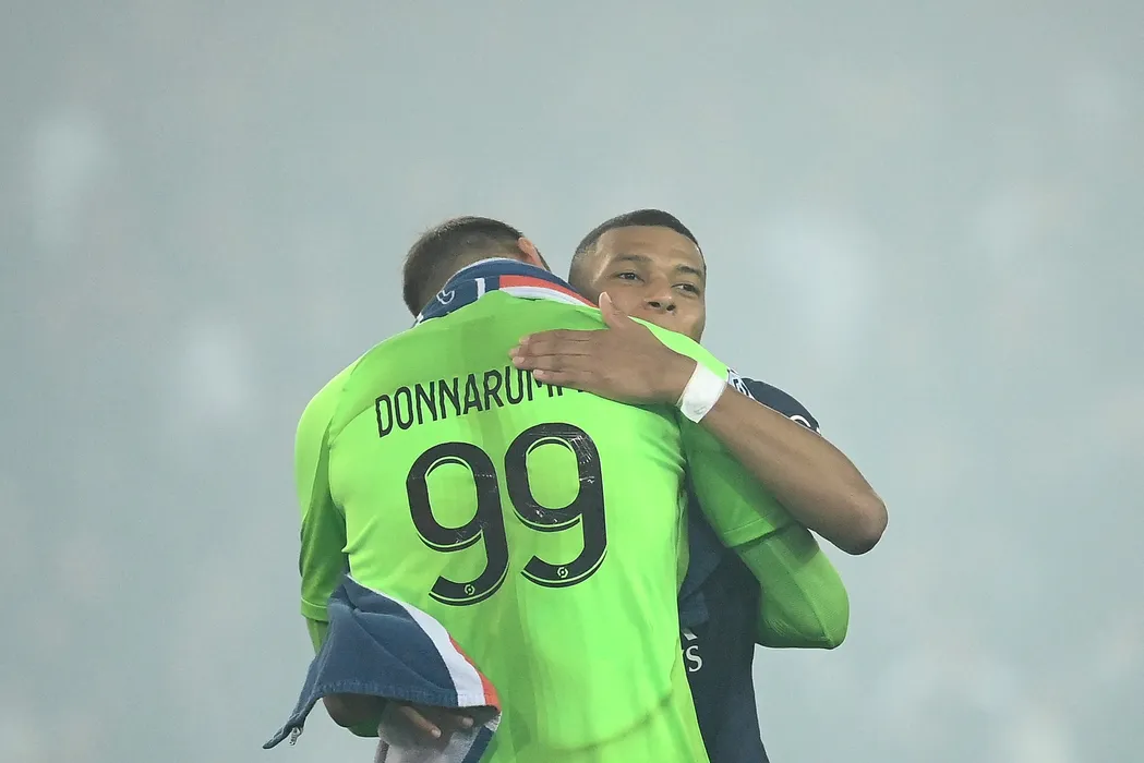 Paris Saint-Germain's Italian goalkeeper Gianluigi Donnarumma hugs Paris Saint-Germain's French forward Kylian Mbappe during the French L1 football match between Paris Saint-Germain (PSG) and Olympique de Marseille (OM) at the Parc des Princes Stadium in Paris, on October 16, 2022.,Image: 731084682, License: Rights-managed, Restrictions: , Model Release: no