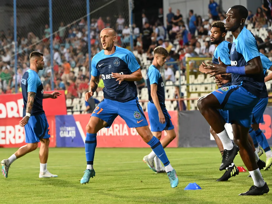 Vlad Iulian Chiriches, Sylas Laouari Edjouma Malcom si Joyskim Aurelien Dawa Tchakonte la incalzire la meciul de fotbal dintre Otelul Galati si FCSB, din cadrul Superligii Superbet, desfasurat pe Stadionul Otelul din Galati, sambata 29 iulie 2023. © FOTO:Razvan Pasarica/SPORT PICTURES