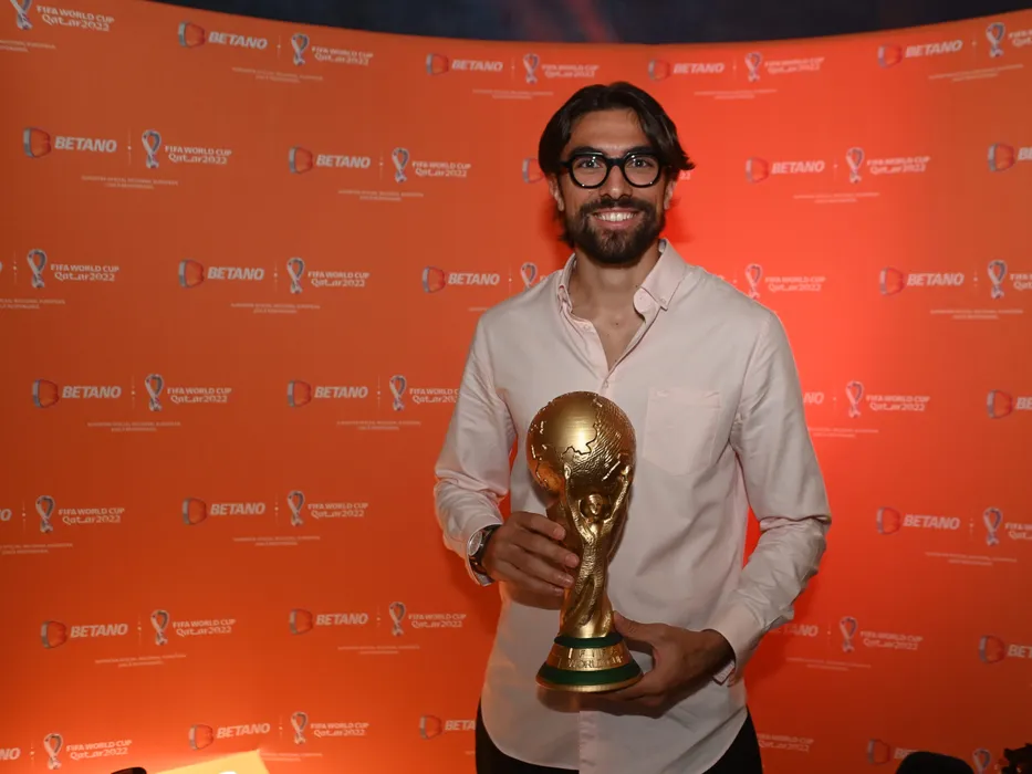 Andrea Compagno pozeaza alaturi de o replica a Cupei Mondiale la evenimentul organizat in parteneriat de Betano si FCSB la Restaurantul Zepelin 1929 din Bucuresti, marti 6 decembrie 2022. © FOTO:Razvan Pasarica/SPORT PICTURES