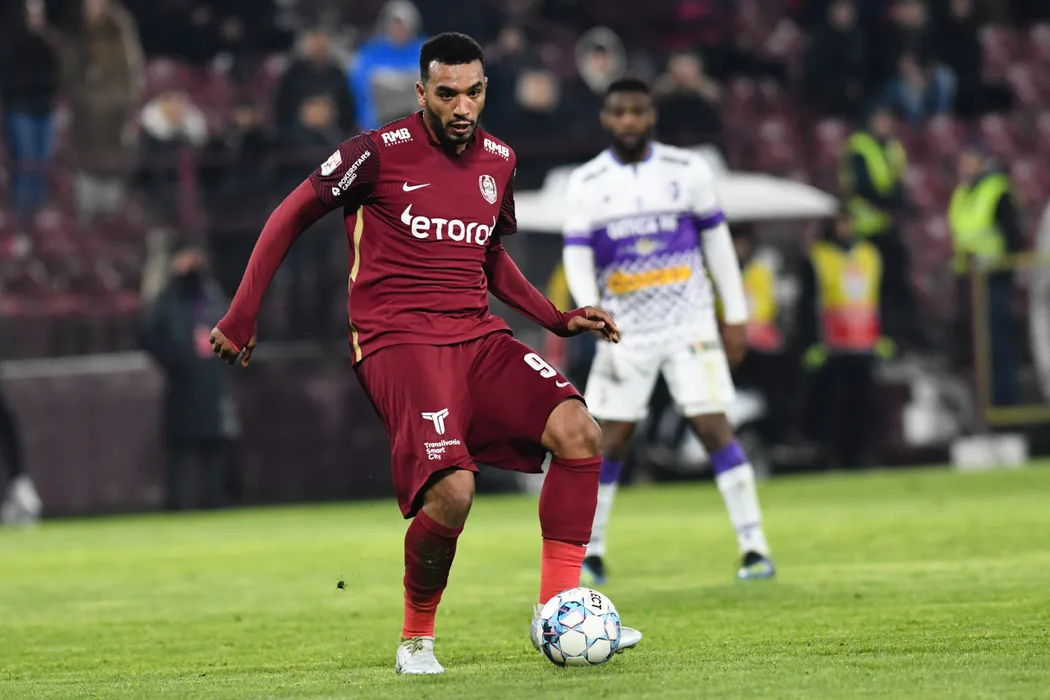 Billel Omrani, de la CFR Cluj, suteaza in timpul meciului de fotbal contra echipei FC Arges din etapa a 3-a a play-off-ului Ligii 1, disputat pe stadionul Dr. Constantin Radulescu din Cluj-Napoca, luni, 4 aprilie 2022. FLAVIU BUBOI / MEDIAFAX FOTO