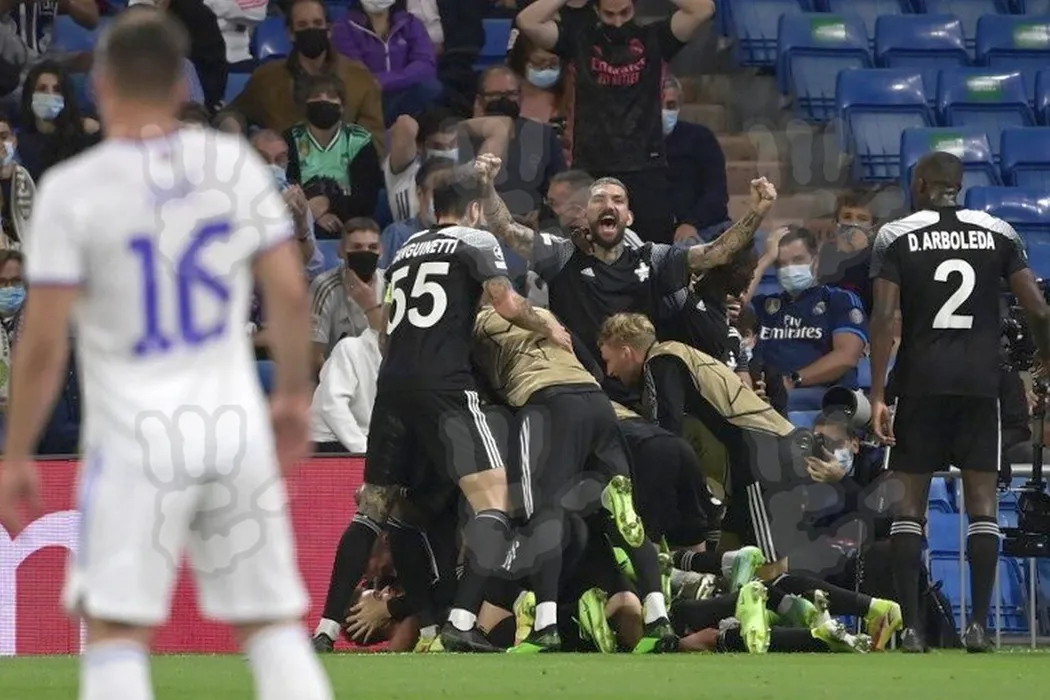 Sheriff's players celebrate their second goal during the UEFA Champions League first round group D footbal match between Real Madrid and Sheriff Tiraspol at the Santiago Bernabeu stadium in Madrid, on September 28, 2021.,Imagine: 635015673, Licenta: Rights-managed, Restrictii: , Model Release: no, Credit line: JAVIER SORIANO / AFP / Profimedia
