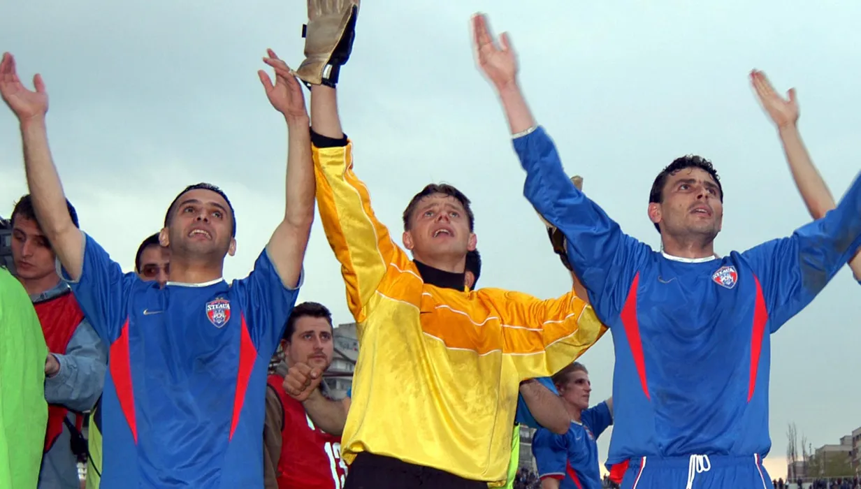Fotbalistii stelisti Marian Aliuta,Martin Tudor,Eugen Trica,George Ogararu si Valeriu Rachita se bucura la final