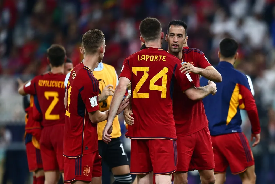 Sergio Busquets of Spain hugs Aymeric Laporte of Spain. Spain v Costa Rica, FIFA World Cup 2022, Group E, Football, Al Thumama Stadium, Doha, Qatar - 23 Nov 2022,Image: 739701728, License: Rights-managed, Restrictions: Editorial Use Only, Model Release: no