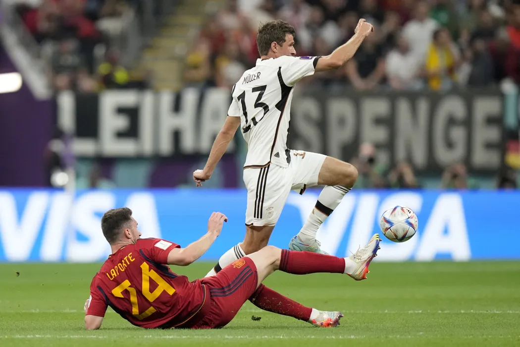 Spain's Aymeric Laporte tries to tackle Germany's Thomas Mueller during the World Cup group E soccer match between Spain and Germany, at the Al Bayt Stadium in Al Khor , Qatar, Sunday, Nov. 27, 2022. (AP Photo/Matthias Schrader)