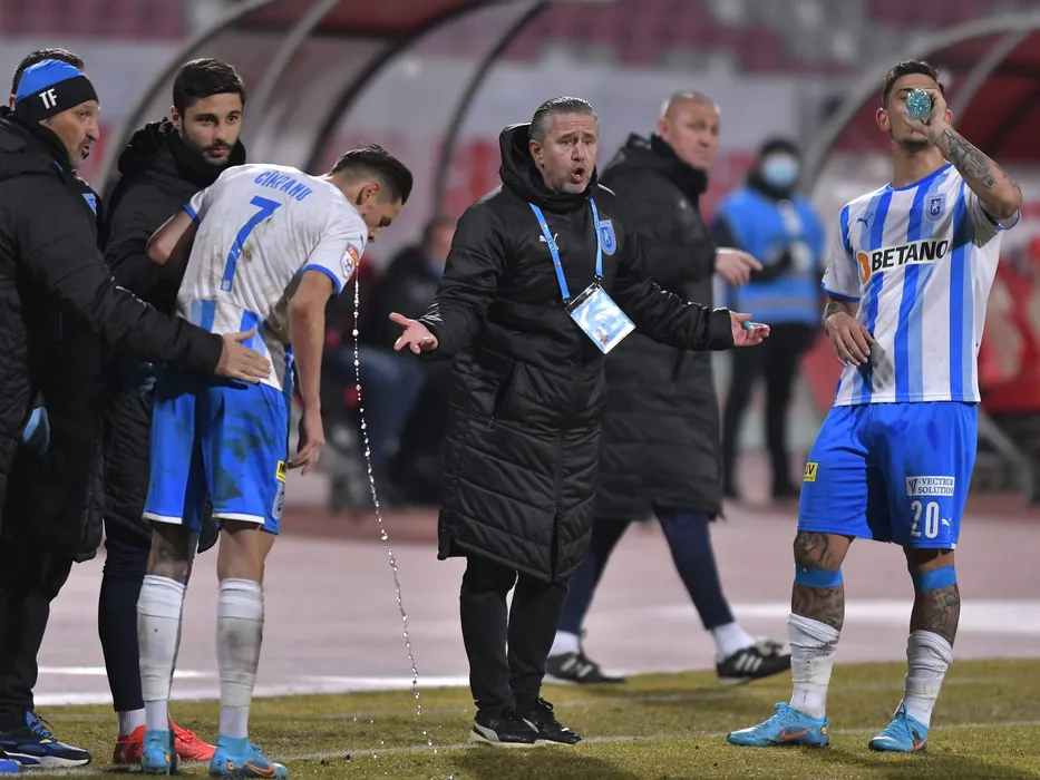 Laurentiu Aurelian Reghecampf reactioneaza alaturi de Alexandru George Cimpanu si Jovan Markovic in meciul de fotbal dintre Dinamo Bucuresti si Universitatea Craiova, contand pentru Liga 1 Casa Pariurilor, desfasurat pe Stadionul Dinamo din Bucuresti, joi 10 februarie 2022. © FOTO:Razvan Pasarica/SPORT PICTURES