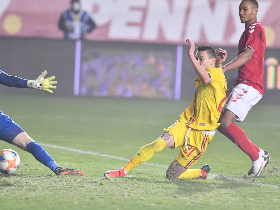 Ionut Valentin Costache marcheaza un gol de langa Nikolas Nartey in meciul de fotbal dintre Romania U21 si Danemarca U21, din cadrul Preliminariilor Campionatului European din 2021, desfasurat fara spectatori pe Stadionul Ilie Oana din Ploiesti, marti 17 noiembrie 2020. © FOTO:Razvan Pasarica/SPORT PICTURES