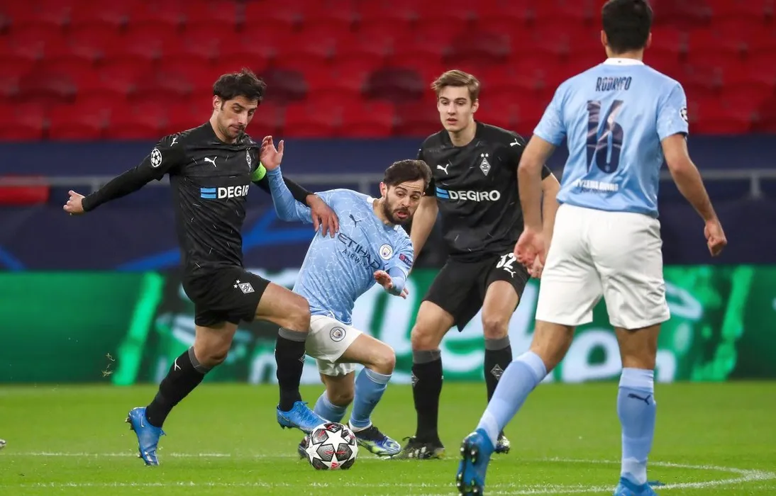 Lars Stindl of Borussia Monchengladbach, Bernardo Silva of Manchester City and Florian Neuhaus of Borussia Monchengladbach with Rodrigo of Manchester City looking on
