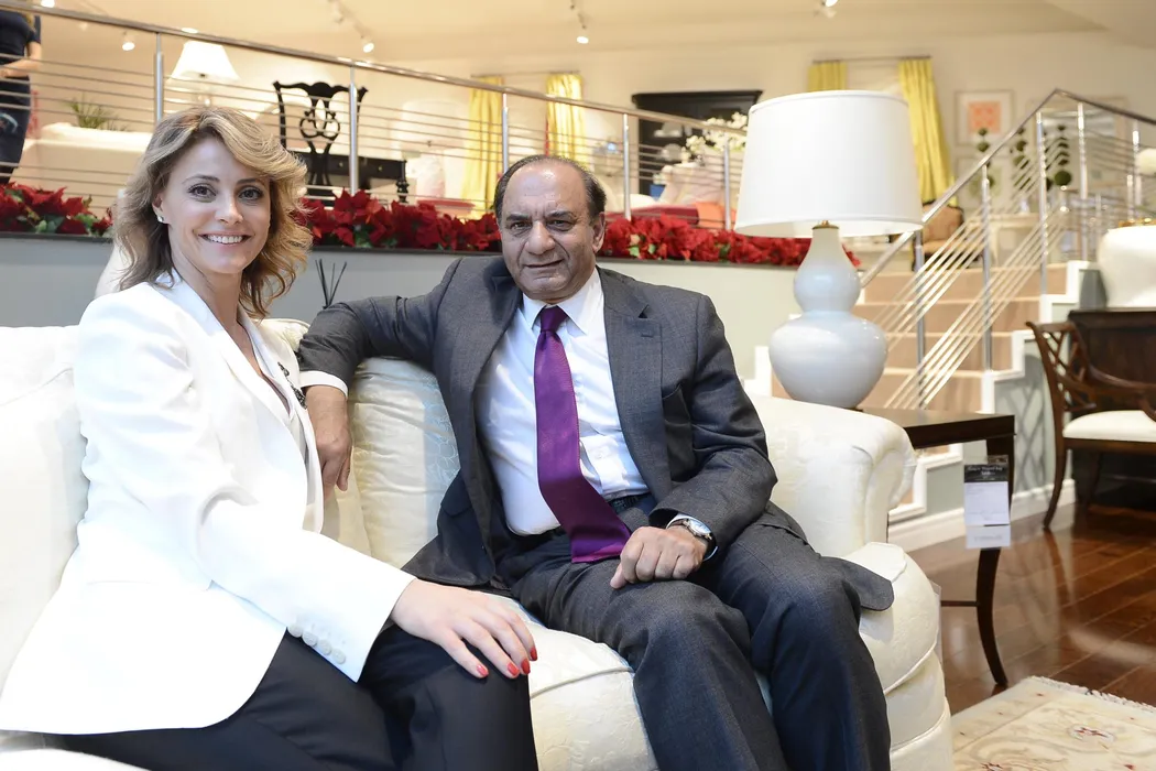 Farooq Kathwari (D), presedinte si director executiv al companiei Ethan Allen Interiors Inc, si Diana Sucu (S) (fosta Lascarescu) pozeaza cu ocazia inaugurarii centrului de design Ethan Allen din Galeria Mobexpert, in Baneasa, joi, 12 decembrie 2013. SILVIU MATEI / MEDIAFAX FOTO