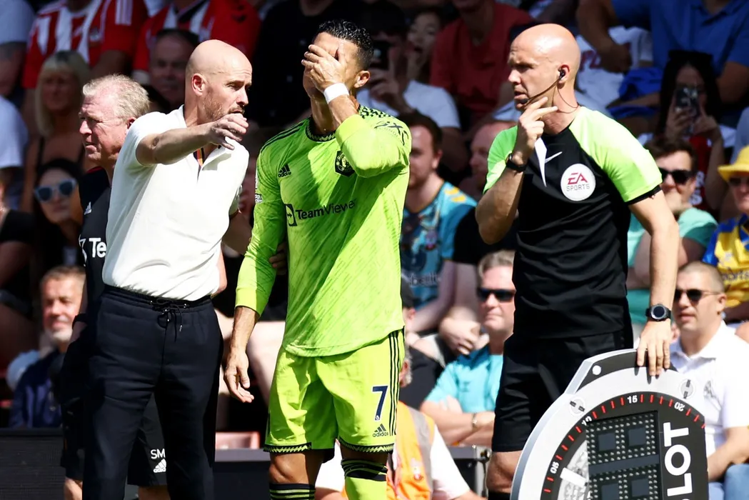 Manchester United Manager Erik ten Hag speaks with Cristiano Ronaldo before he is substituted on.