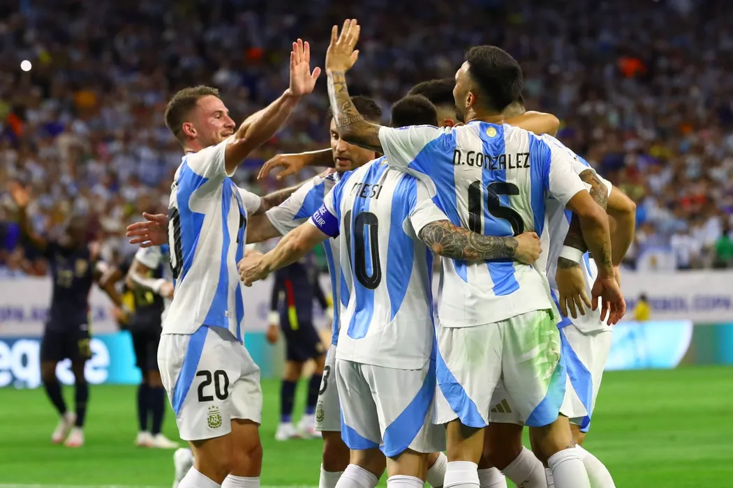 Argentina s defender Lisandro Martinez celebrates with teammates after scoring a goal against X during the Copa America USA 2024, quarterfinal match between Argentina and Ecuador, at NRG stadium in Houston, on July 4, 2024. HOUSTON UNITED STATES *** Argentina s defender Lisandro Martinez celebrates with teammates after scoring a goal against X during the Copa America USA 2024, quarterfinal match between Argentina and Ecuador, at NRG stadium in Houston, on July 4, 2024 HOUSTON UNITED STATES Copyright: xALEJANDROxPAGNIx,Image: 887379717, License: Rights-managed, Restrictions: Credit images as "Profimedia/ IMAGO", Model Release: no