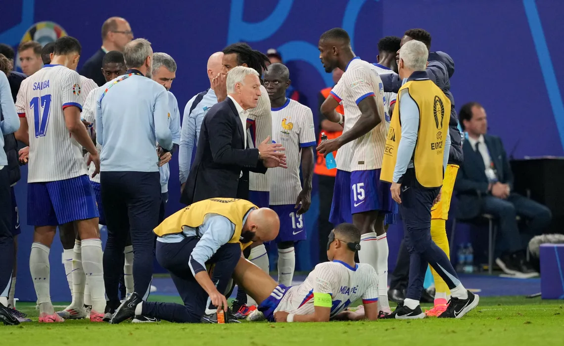 05 July 2024, Hamburg: France coach Didier Deschamps (C) speaks to his players while Kylian Mbappe lies on the ground before extra time of the UEFA EURO 2024 quarter-final soccer match between Portugal and France at the Volksparkstadion Hamburg. Photo: Sören Stache/dpa/HEPTA/SPORT PICTURES