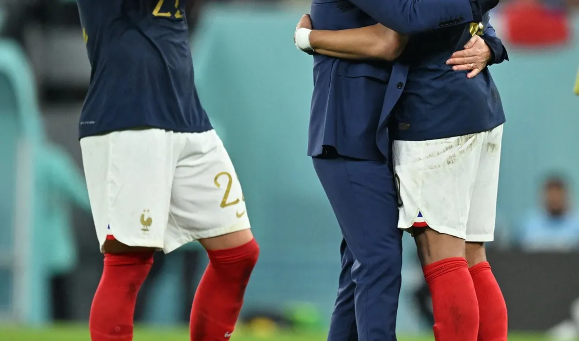 DOHA, QATAR - NOVEMBER 26: Head coach Didier Deschamps of France and Kylian Mbappe hug each other after their win following the FIFA World Cup Qatar 2022 Group D match between France and Denmark at Stadium 974 in Doha, Qatar on November 26, 2022. Mustafa Yalcin / Anadolu Agency/ABACAPRESS.COM,Image: 740374041, License: Rights-managed, Restrictions: , Model Release: no