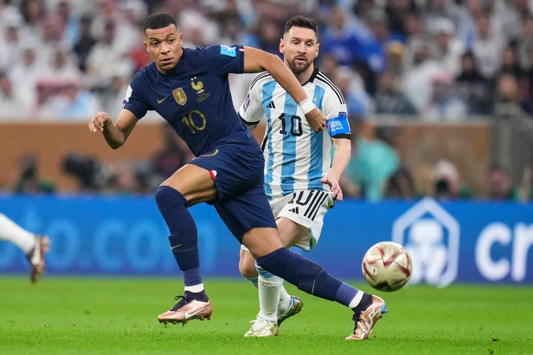 France's Kylian Mbappe and Argentina's Lionel Messi go for the ball during the World Cup final soccer match between Argentina and France at the Lusail Stadium in Lusail, Qatar, Sunday, Dec.18, 2022.,Image: 745366378, License: Rights-managed, Restrictions: This content is intended for editorial use only. For other uses, additional clearances may be required., Model Release: no, Pictured: Kylian Mbappe Lottin,Lionel Messi,Manu Fernandez