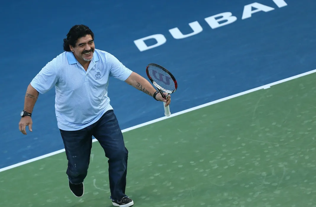 Argentina's football legend Diego Maradona runs as he plays against his compatriot tennis player Juan Martin Del Potro during a show following Del Potro's victory against India's Somdev Devvarman during the ATP Dubai Open tennis tournament in the Gulf emirate on February 27, 2013. AFP PHOTO/MARWAN NAAMANI (Photo credit should read MARWAN NAAMANI/AFP/Getty Images)