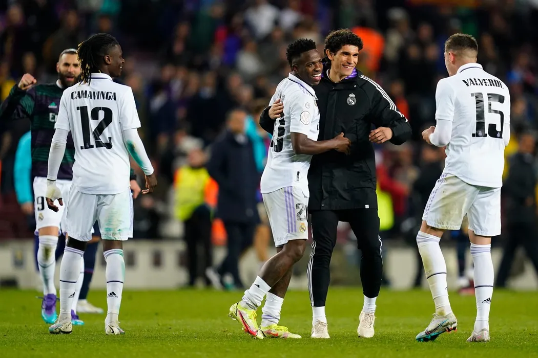Vinicius Jr of Real Madrid celebrating the victory with Fede Valverde and Jesus Vallejo of Real Madrid during Copa del Rey match, Semi-Finals, second leg, between FC Barcelona v Real Madrid. played at Spotify Camp Nou Stadium on April 5, 2023 in Barcelona, Spain.,Image: 767474742, License: Rights-managed, Restrictions: World Rights Except Japan, Spain, France and The Netherlands * ESPOUT FRAOUT JPNOUT NLDOUT, Model Release: no