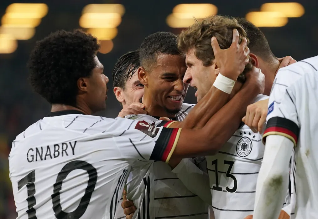 Germany's Thomas Mueller (R) celebrates scoring his side's second goal with team mates in meciul de fotbal dintre Germania si Romania, contand pentru preliminariile Campionatului Mondial din 2022, desfasurat pe Stadionul Vorksparkstadion din Hamburg, vineri 8 octombrie 2021. © FOTO:SPORT PICTURES