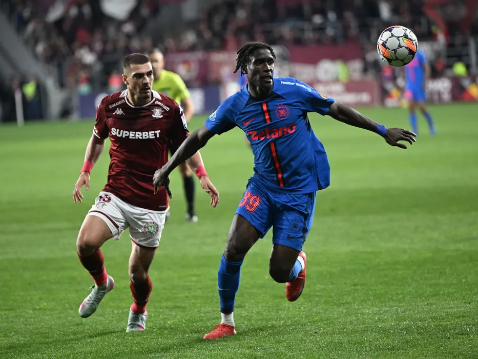 Denis Ciobotariu si Jordan Youri Gele in meciul de fotbal dintre Rapid Bucuresti si FCSB, din cadrul Play off-ului Superligii Superbet, desfasurat pe Superbet Arena Giulesti din Bucuresti, luni 27 aprilie 2025. © FOTO:Razvan Pasarica/SPORT PICTURES