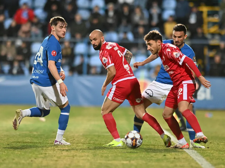 Constantin Grameni, Gabriel Rodrigues De Moura, Cristian George Ganea si Andrei Ahmed Mustafa Bani în meciul de fotbal dintre Farul Constanta si Dinamo Bucuresti, contând pentru Superliga Superbet, desfășurat pe Stadionul central al Academiei Gheorghe Hagi din Ovidiu, luni 12 februarie 2024. © FOTO: Răzvan PĂSĂRICĂ/SPORT PICTURES