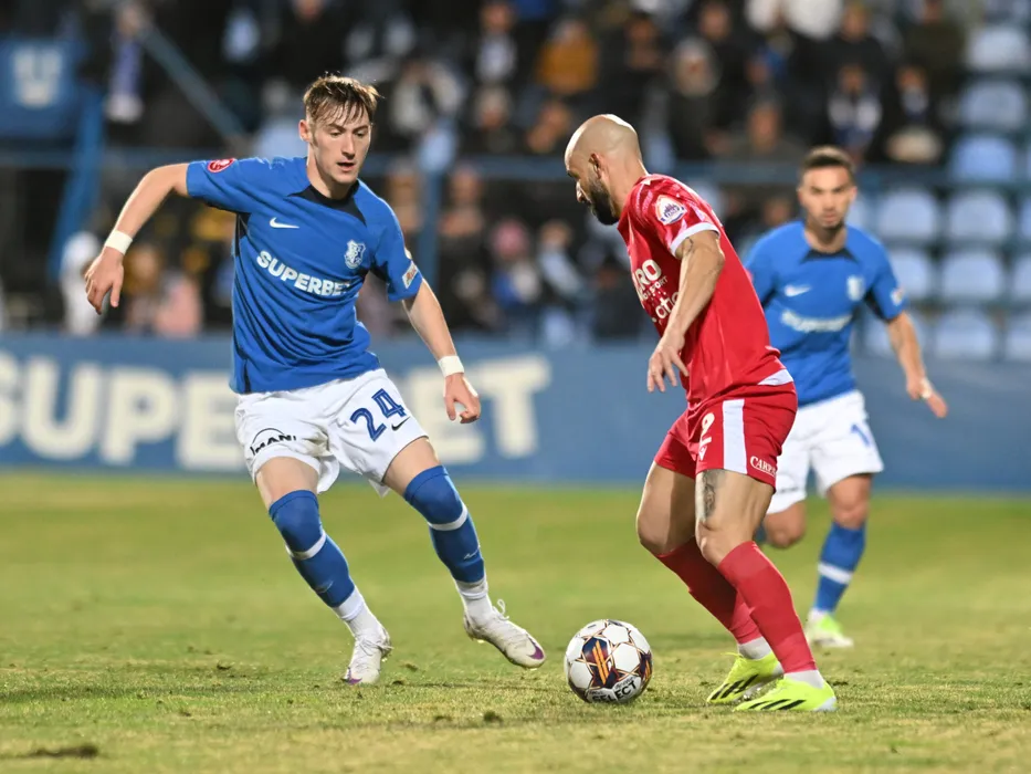 Constantin Grameni si Gabriel Rodrigues De Moura în meciul de fotbal dintre Farul Constanta si Dinamo Bucuresti, contând pentru Superliga Superbet, desfășurat pe Stadionul central al Academiei Gheorghe Hagi din Ovidiu, luni 12 februarie 2024. © FOTO: Răzvan PĂSĂRICĂ/SPORT PICTURES