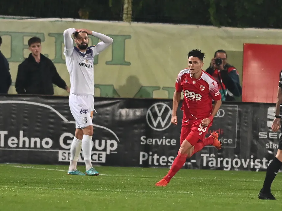 Alexandru Pop se bucura dupa un gol marcat spre dezamagirea lui Alin Dobrosavlevici in meciul de fotbal dintre FC Arges si Dinamo Bucuresti, contand pentru mansa retur a Barajului pentru mentinerea in Superliga Superbet, desfasurat pe Stadionul Orasenesc din Mioveni, sambata 3 iunie 2023. © FOTO:Razvan Pasarica/SPORT PICTURES