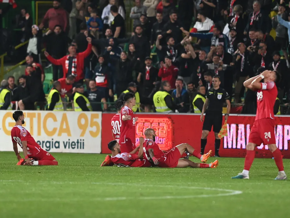 Bucurie a fotbalistilor dinamovisti dupa un gol marcat de catre Alexandru Pop in meciul de fotbal dintre FC Arges si Dinamo Bucuresti, contand pentru mansa retur a Barajului pentru mentinerea in Superliga Superbet, desfasurat pe Stadionul Orasenesc din Mioveni, sambata 3 iunie 2023. © FOTO:Razvan Pasarica/SPORT PICTURES