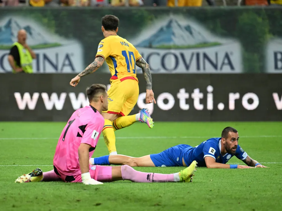 Dennis Man se bucura dupa un gol marcat in poarta lui Joel Mall de langa Charalampos Kyriakou in meciul de fotbal dintre Romania si Cipru, din cadrul Preliminariilor Campionatului Mondial 2026, desfasurat pe Arena Nationala din Bucuresti, marti 10 iunie 2025. © FOTO:Razvan Pasarica/SPORT PICTURES