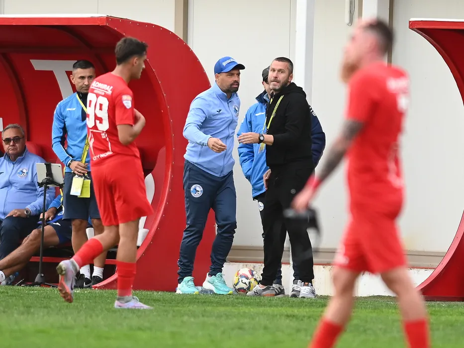 Cei doi antrenori Stefan Odoroaba si Florin Sandu Maxim se saluta dupa meciul de fotbal dintre CS Tunari si Corvinul Hunedoara, contand pentru Liga a-2-a Casa Pariurilor, desfasurat pe Stadionul din Tunari, luni 9 octombrie 2023. © FOTO:Razvan Pasarica/SPORT PICTURES