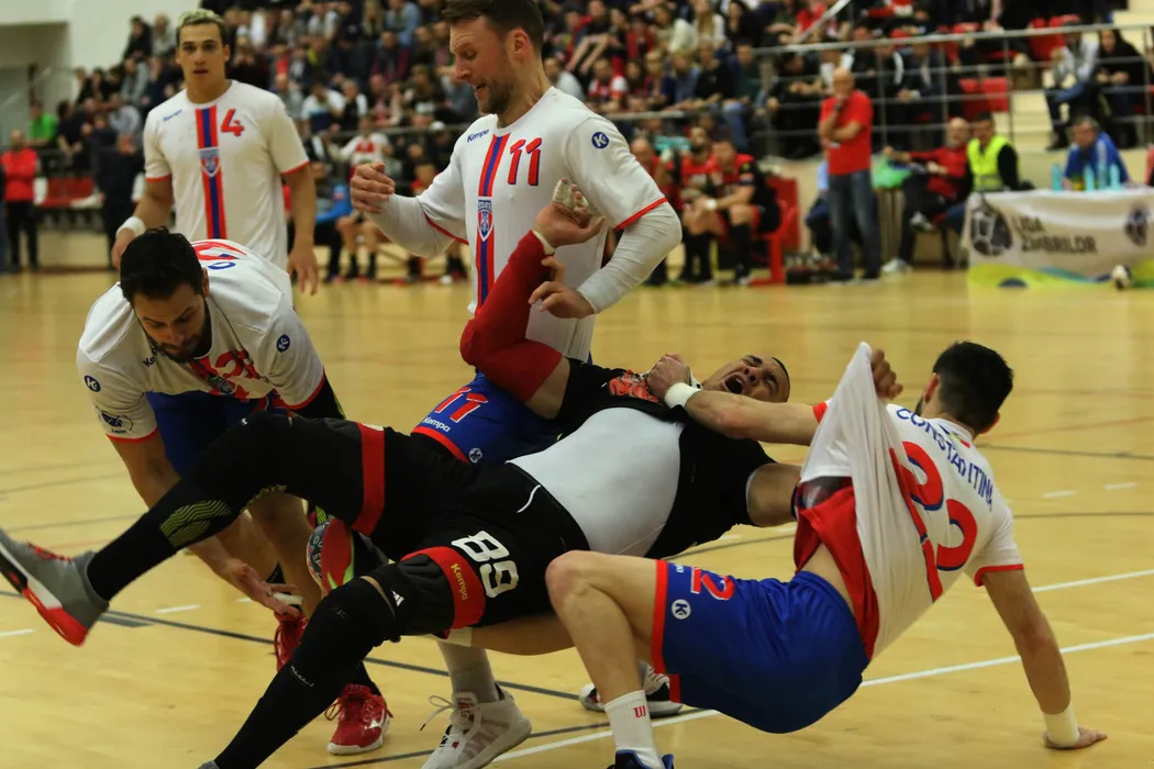 Formatiile CS Dinamo (echipament negru-rosu) si Steaua s-au intalnit intr-o partida contand pentru etapa cu numarul 21 a Ligii Nationale la handbal masculin, joi 5 martie 2020, in sala Dinamo din Bucuresti. GEORGE FLUSTER / MEDIAFAX FOTO