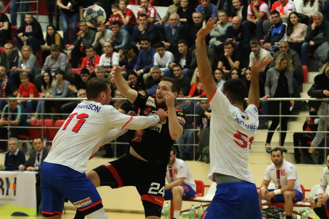Negru Nicusor de la CS Dinamo (echipament negru-rosu) este impiedicat sa arunce la poarta adversarilor de la Steaua in timpul unei partide contand pentru etapa cu numarul 21 a Ligii Nationale la handbal masculin, joi 5 martie 2020, in sala Dinamo din Bucuresti. GEORGE FLUSTER / MEDIAFAX FOTO