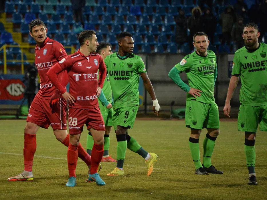 Realdo Fili si Azankpo Desire Segbe in meciul de fotbal dintre FC Botosani si Dinamo Bucuresti, contand pentru Liga 1 Casa Pariurilor, desfasurat pe Stadionul Municipal din Botosani, luni 07 februarie 2022. © FOTO:Ionut Tabultoc/SPORT PICTURES