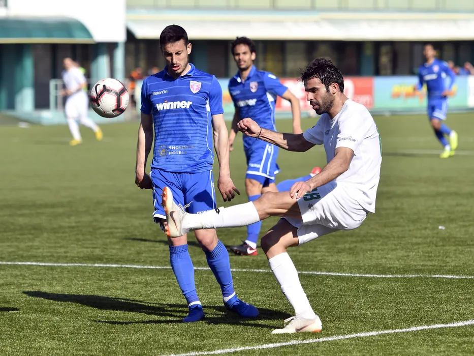 Ricardinho si Sofien Moussa in meciul de fotbal dintre Concordia Chiajna si FC Voluntari, din cadrul play out-ului Ligii 1 Betano, disputat pe Stadionul comunal Concordia din Chiajna, duminica 31 martie 2019. © FOTO:Razvan Pasarica/SPORT PICTURES