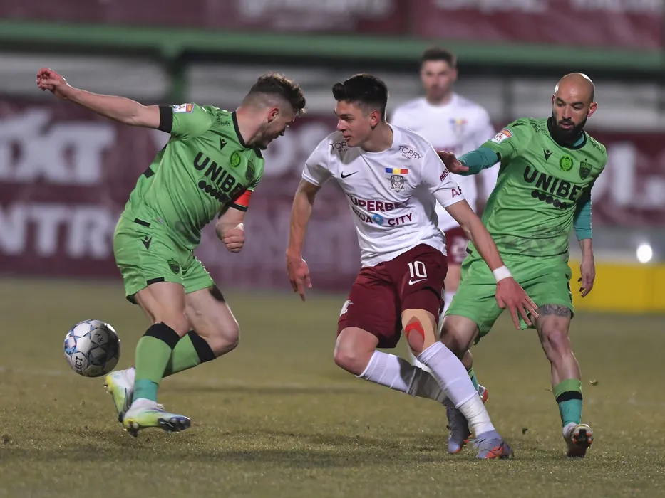 Gabriel Andrei Torje, Rares Andrei Ilie si Gabriel Rodrigues De Moura in meciul de fotbal dintre Rapid Bucuresti si Dinamo Bucuresti, contand pentru Play-out-ul Ligii 1 Casa Pariurilor, desfasurat pe Stadionul Orasenesc din Mioveni, duminica 13 martie 2022. © FOTO:Razvan Pasarica/SPORT PICTURES