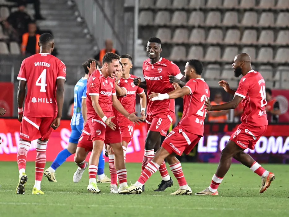 Bucurie a fotbaliștilor dinamoviști Andrei Ahmed Mustafa Bani, Georgi Milanov Ventsislavov, Catalin Ionut Cirjan, Vhakka Eddy Stelh Gnahore, Maxime James Sivis si Hakim Djamel Abdallah după un gol marcat in meciul de fotbal dintre Dinamo Bucuresti si Universitatea Craiova, din cadrul Superligii Superbet, desfasurat pe Stadionul National Arcul de Triumf din Bucuresti, sambata 24 august 2024. © FOTO:Razvan Pasarica/SPORT PICTURES