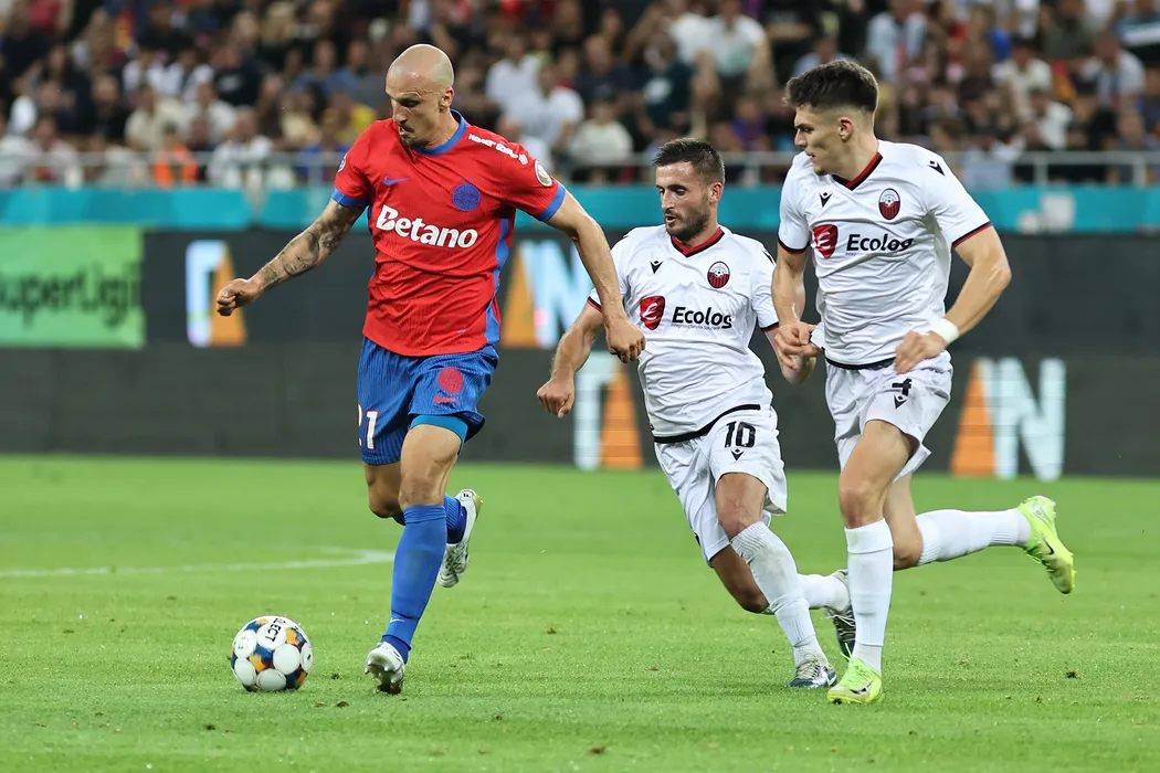 Vlad Chiriches (S), de la FCSB, lupta pentru balon cu Endrit Krasniqi (C) si Reshat Ramadani (D), de la KF Shkendija, in timpul meciului de fotbal din preliminariile Ligii Campionilor, disputat pe Arena Nationala din Bucuresti, miercuri, 30 iulie 2025. GEORGE FLUSTER / MEDIAFAX FOTO