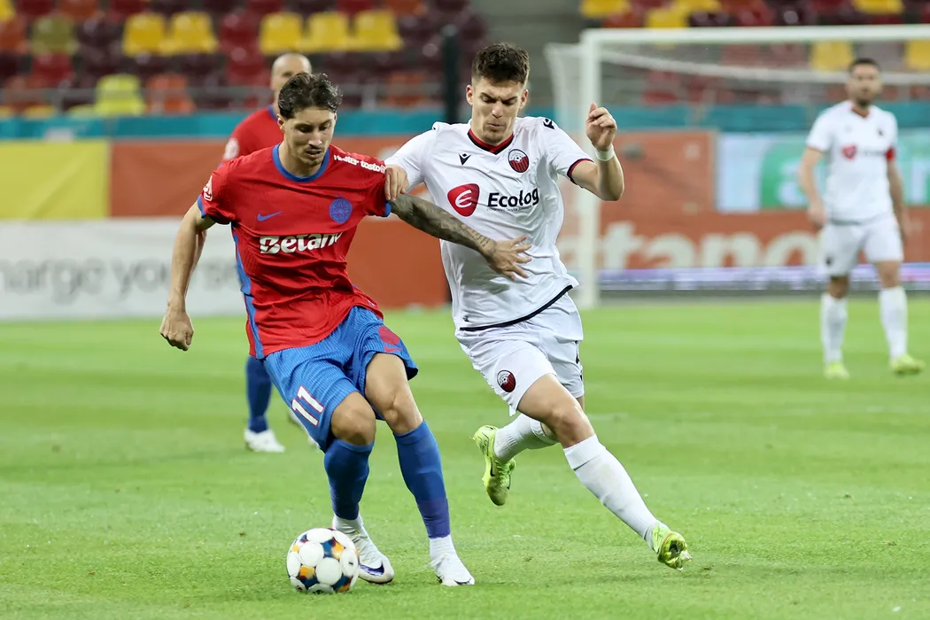 David Miculescu (S), de la FCSB, lupta pentru balon cu Reshat Ramadani (D), de la KF Shkendija, in timpul meciului de fotbal din preliminariile Ligii Campionilor, disputat pe Arena Nationala din Bucuresti, miercuri, 30 iulie 2025. GEORGE FLUSTER / MEDIAFAX FOTO
