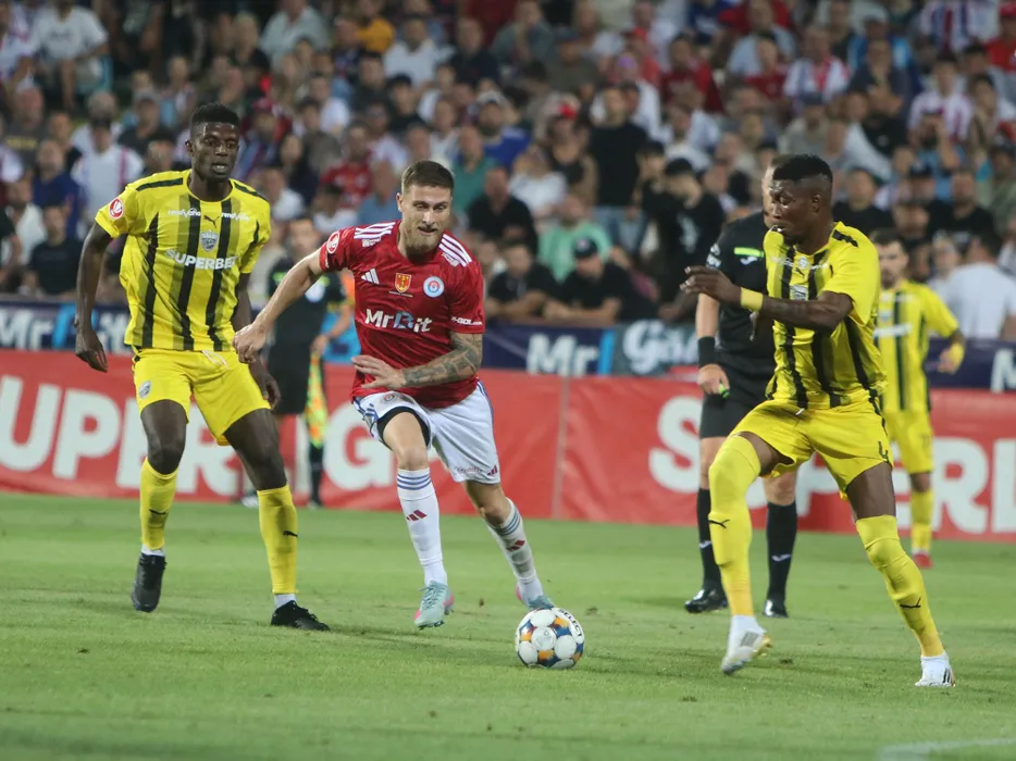 Kennedy Kofi Boateng, Vhakka Eddy Stelh Gnahore si Paulo Rafael Pereira Araujo in meciul de fotbal dintre SC Otelul Galati si Dinamo Bucuresti, contand pentru Superliga Superbet, desfasurat pe Stadionul Otelul din Galati, duminica 27 iulie 2025. © FOTO:Valentin Munteanu/SPORT PICTURES