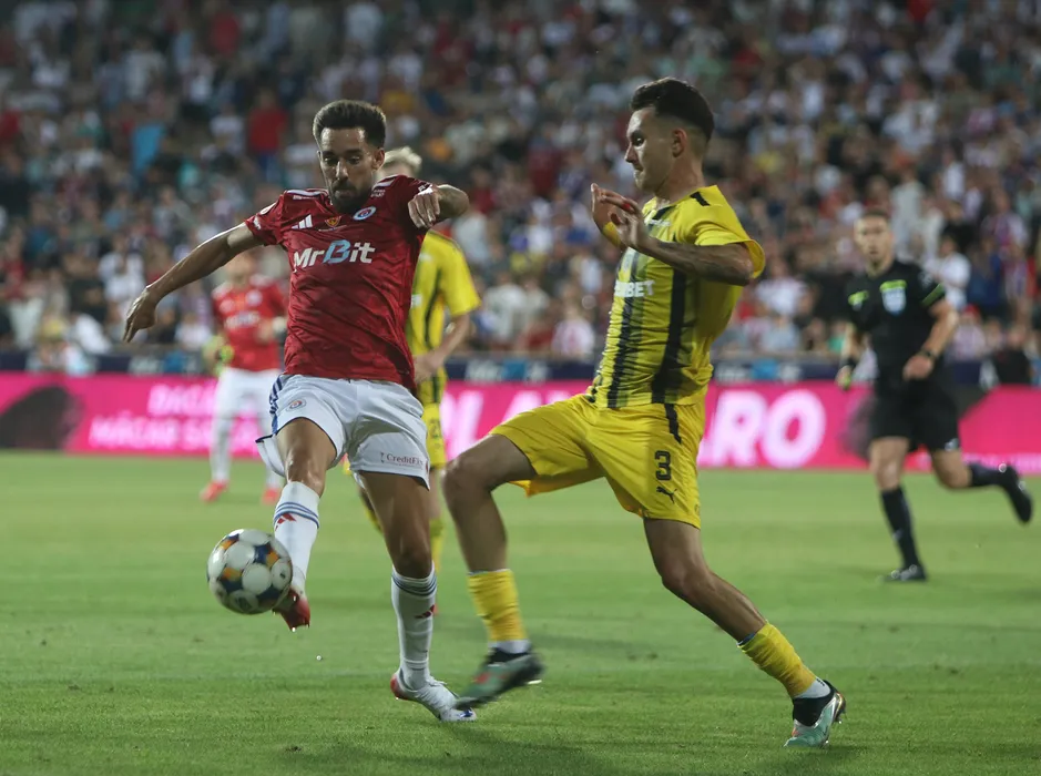Andre Miguel Pinto Lopes si Raul Marian Oprut in meciul de fotbal dintre SC Otelul Galati si Dinamo Bucuresti, contand pentru Superliga Superbet, desfasurat pe Stadionul Otelul din Galati, duminica 27 iulie 2025. © FOTO:Valentin Munteanu/SPORT PICTURES