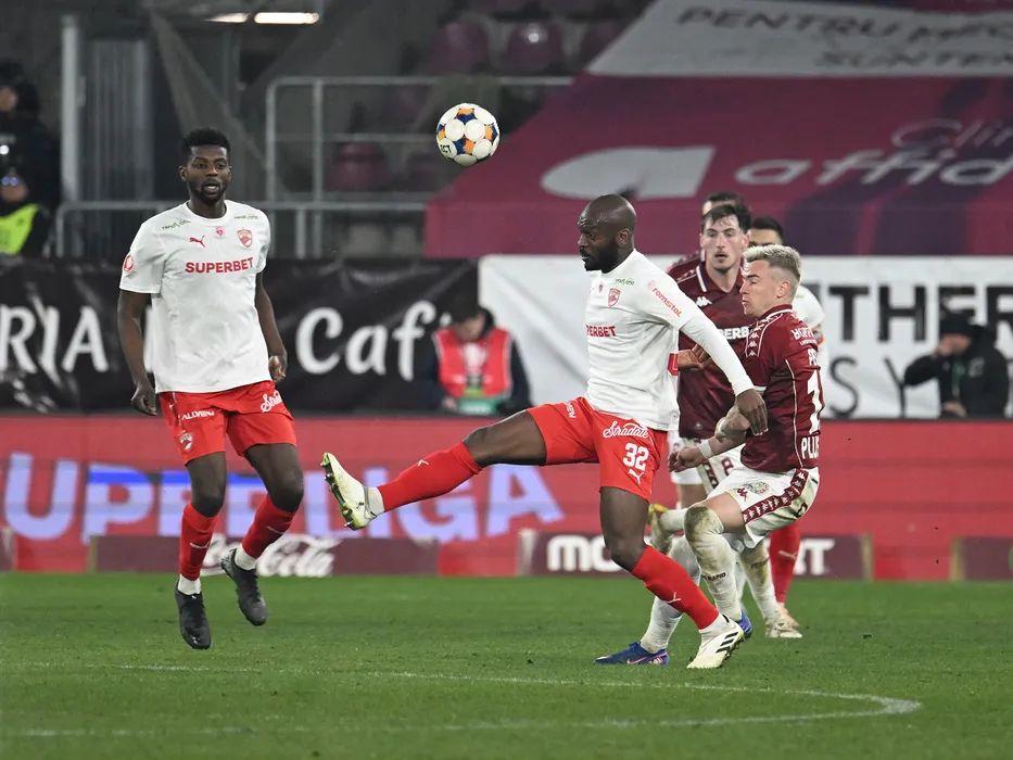 Kennedy Kofi Boateng, Jordan Ikoko si Claudiu Adrian Mihai Petrila in meciul de fotbal dintre Rapid Bucuresti si Dinamo Bucuresti, din cadrul Play off-ului Superligii Superbet, desfasurat pe Superbet Arena-Giulesti din Bucuresti, sambata 14 martie 2026. © FOTO:Razvan Pasarica/SPORT PICTURES