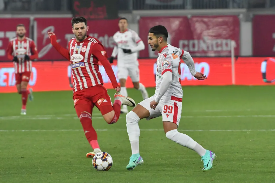 Lamine Ghezali și Isnik Alimi în meciul de fotbal dintre FC Sepsi OSK Sfantu Gheorghe și SC Dinamo 1948 Bucuresti, contând pentru SuperLiga Superbet, desfășurat pe Stadionul SEPSI Arena OSK din Sfântu Gheorghe, luni 4 decembrie 2023. © FOTO: Bogdan BALAS/SPORT PICTURES