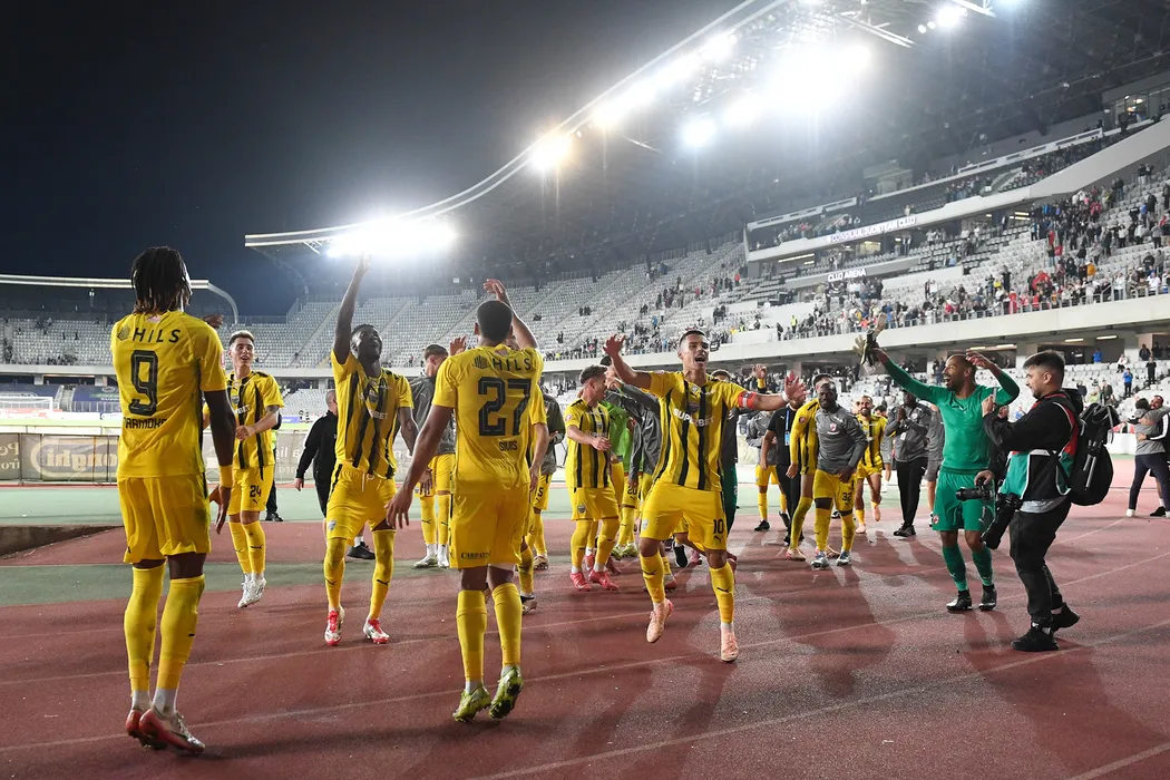 Fotbalistii dinamovisti Mamoudou Karamoko, Adrian Iulian Caragea, Kennedy Kofi Boateng, Catalin Ionut Cirjan si Devis Rogers Epassy Mboka saluta galeria dupa meciul de fotbal dintre Universitatea Cluj si Dinamo Bucuresti, contând pentru Superliga Superbet, desfășurat pe Cluj Arena din Cluj Napoca, sambata 23 august 2025. © FOTO:Flaviu Buboi/SPORT PICTURES