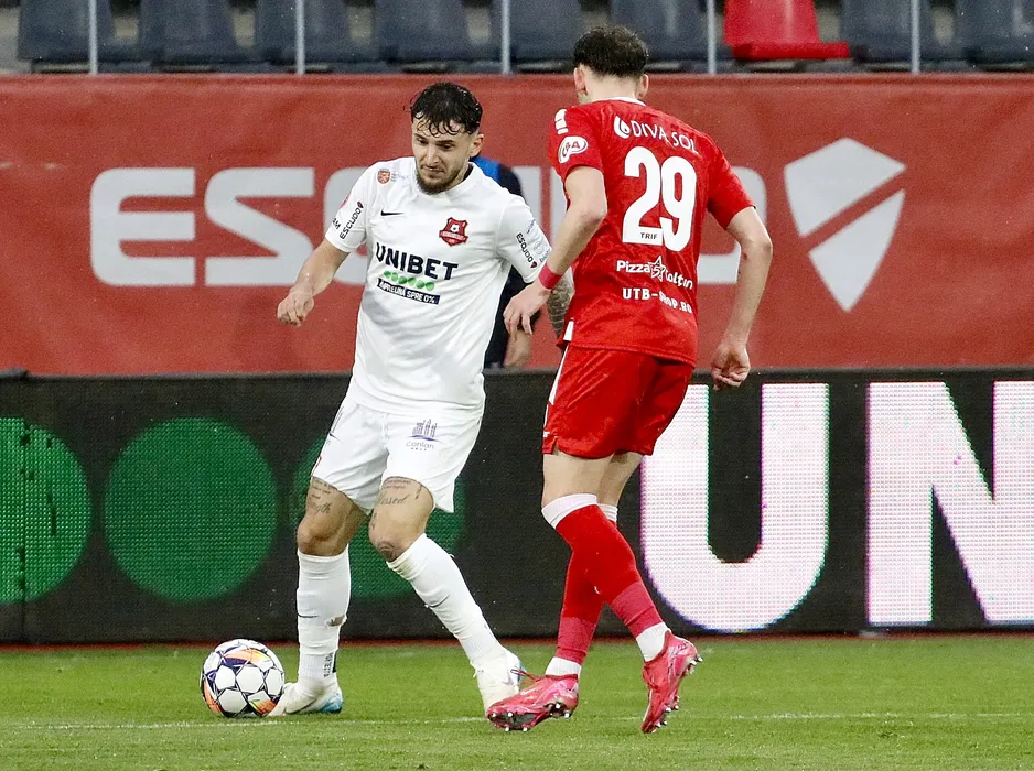 Ianis Ilie Stoica si Razvan Alin Trif in meciul de fotbal dintre AFC Hermannstadt Sibiu si UTA Arad, contand petru Superliga Superbet - Play-Out, desfasurat pe Stadionul Municipal din Sibiu, sambata 26 aprilie 2025. © FOTO: Valentin Macrea/SPORT PICTURES