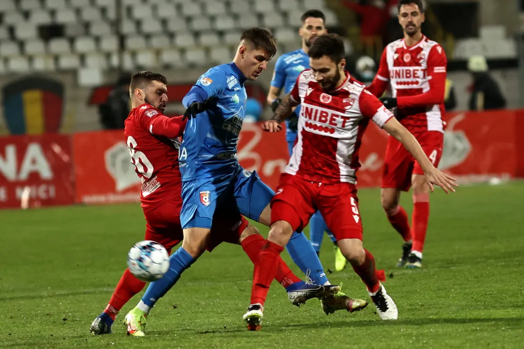 Meciul de fotbal dintre echipele FC Dinamo si Chindia Targoviste (echipament albastru) din etapa a XIX-a a Ligii 1, disputat pe stadionul Dinamo din Bucuresti, luni, 13 decembrie 2021. GEORGE FILIP / MEDIAFAX FOTO