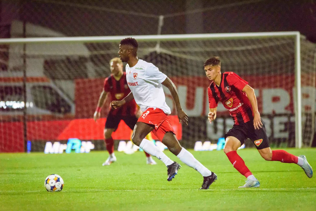 Vhakka Eddy Stelh Gnahore si Bálint Szabó in meciul de fotbal dintre FK Csikszereda Miercurea Ciuc si Dinamo Bucuresti, contand pentru Superliga Superbet, desfasurat pe Stadionul Municipal din Miercurea Ciuc, luni 14 iulie 2025. © FOTO:Zoltan Pal/SPORT PICTURES