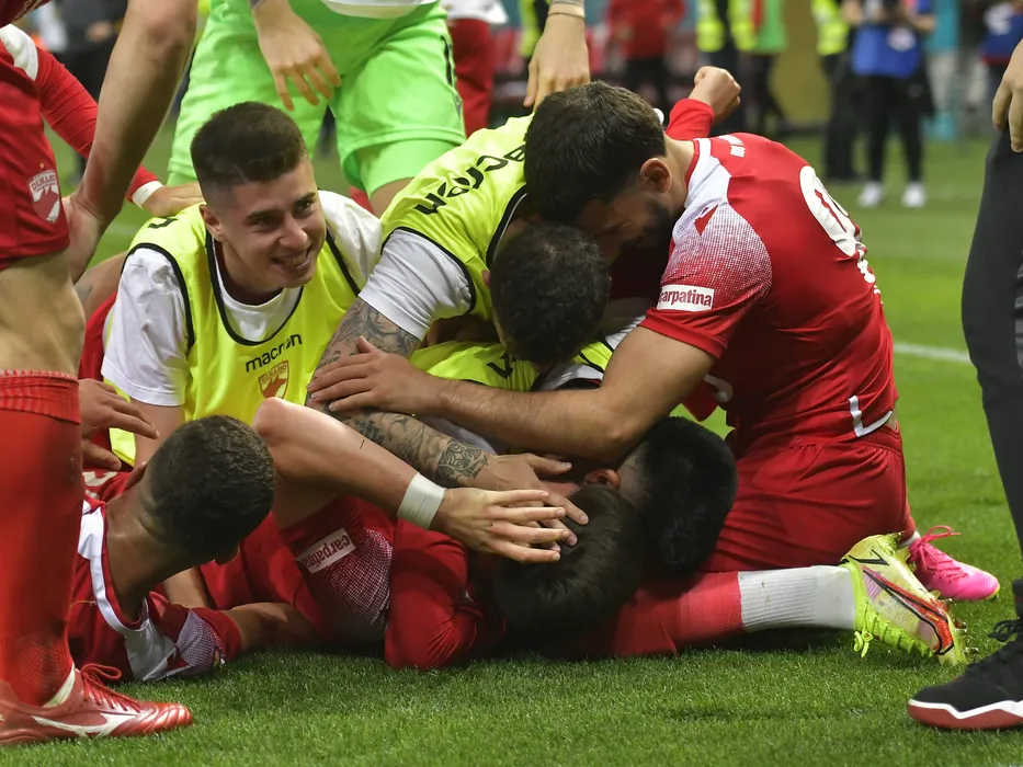Bucurie a fotbalistilor dinamovisti Quentin Alexandre Bena si Deniz Giafer dupa un gol marcat in meciul de fotbal dintre Dinamo Bucuresti si CSA Steaua Bucuresti, contand pentru Play-off-ul Ligii a-2-a Casa Pariurilor, desfasurat pe Arena Nationala din Bucuresti, luni 15 mai 2023. © FOTO:Razvan Pasarica/SPORT PICTURES