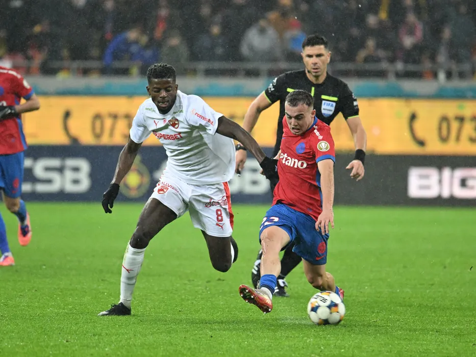 Vhakka Eddy Stelh Gnahore si Mihai Vlăduț Toma in meciul dintre FCSB si Dinamo Bucuresti, contand pentru Superliga Superbet, desfasurat pe Arena Nationala din Bucuresti, sambata 6 decembrie 2025. © FOTO:Razvan Pasarica/SPORT PICTURES